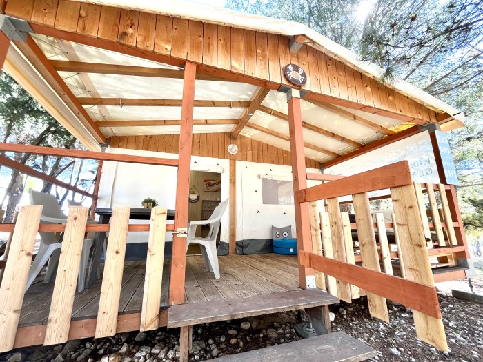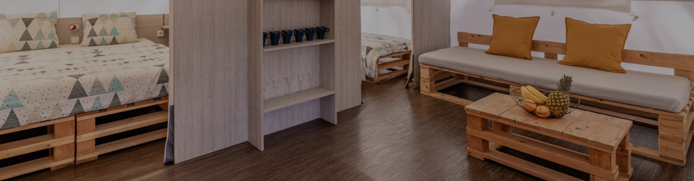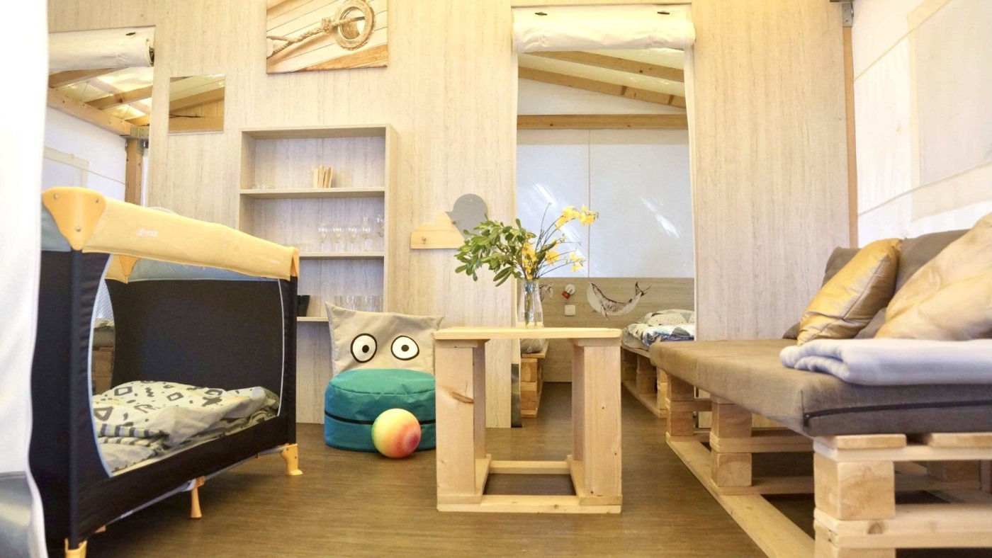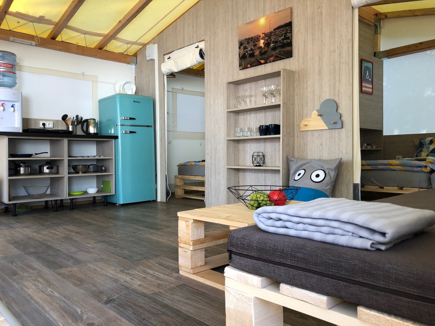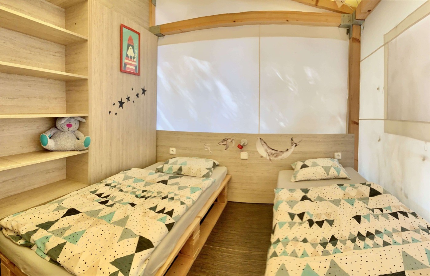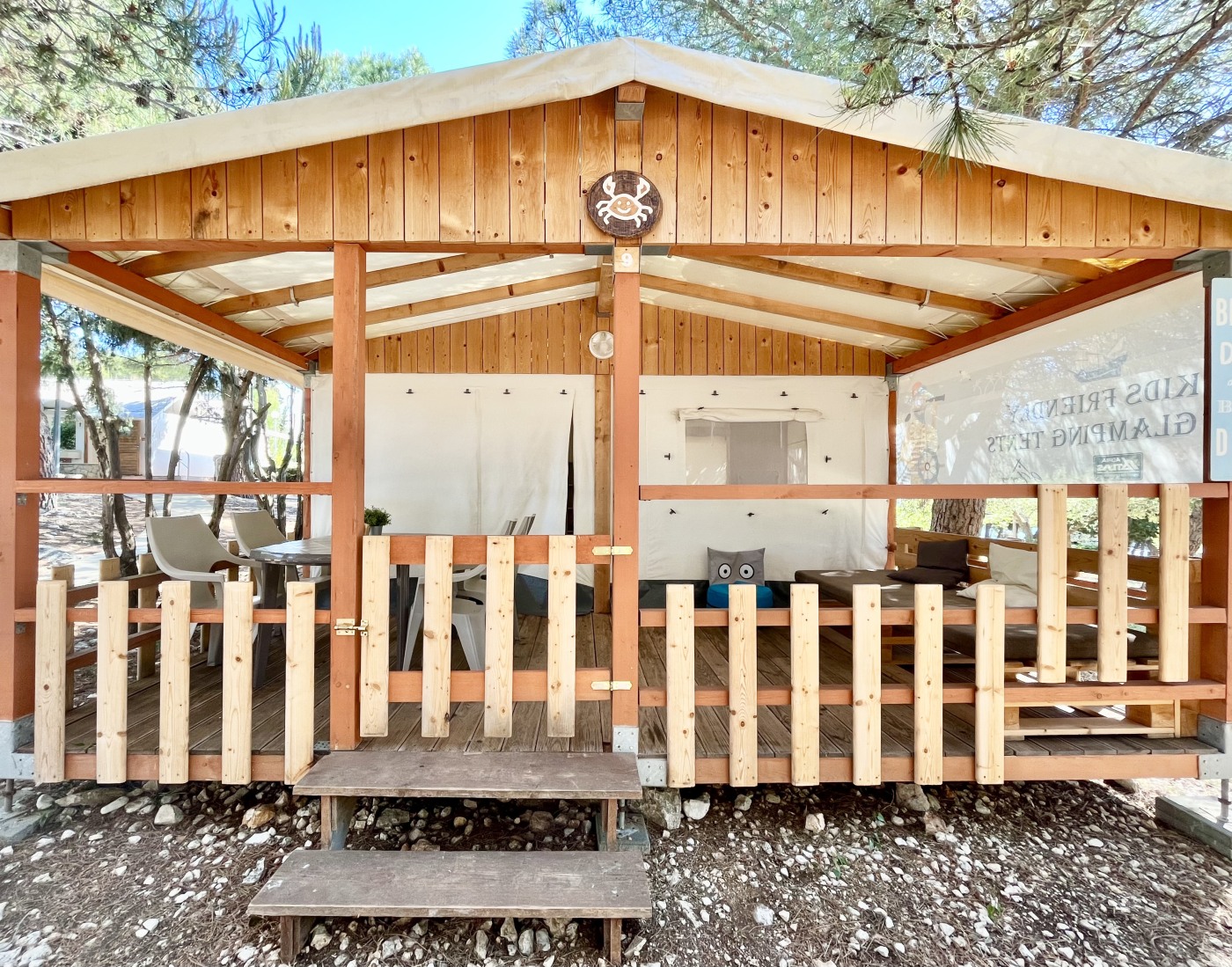 Ve velmi prostorných (35 m2) a vzdušných KIDS FRIENDLY Glamping máte k dispozici 2 ložnice – každou s dvoulůžkem s možností rozdělit na 2 samostatné postele. V denní části plně vybavenou kuchyň, dostatečný prostor pro stolování a paletovou pohovkou – která může sloužit také jako plnohodnotné lůžko pro pátou osobu. Všechny místnosti jsou od sebe odděleny pevnou nábytkovou stěnou. Velkou část ubytování tvoří prostorná zastřešená terasa, kde se pohodlně usadí až 6 osob. Pro větší soukromí a ochranu před sluníčkem jsme ji nově vybavili vzdušnými závěsy. Ubytování je mimo jiné vybaveno i výdejníkem chlazené vody a stojanovým ventilátorem, které vám zpříjemní pobyt během parných dnů.